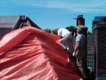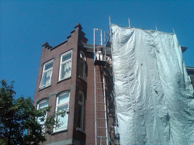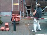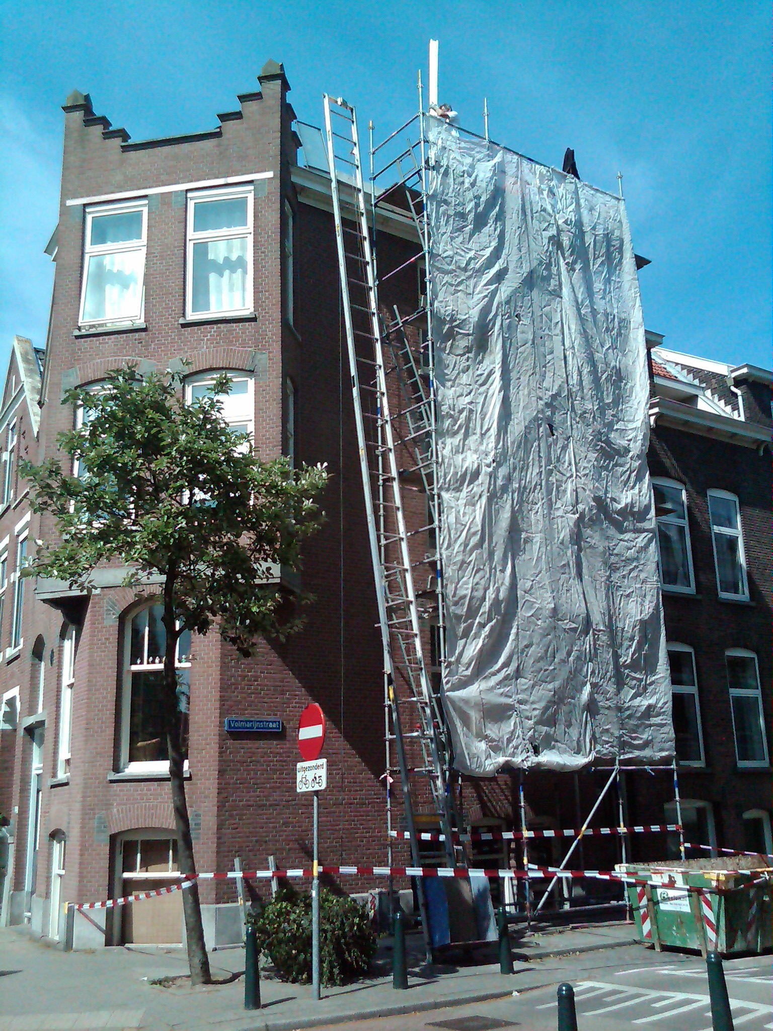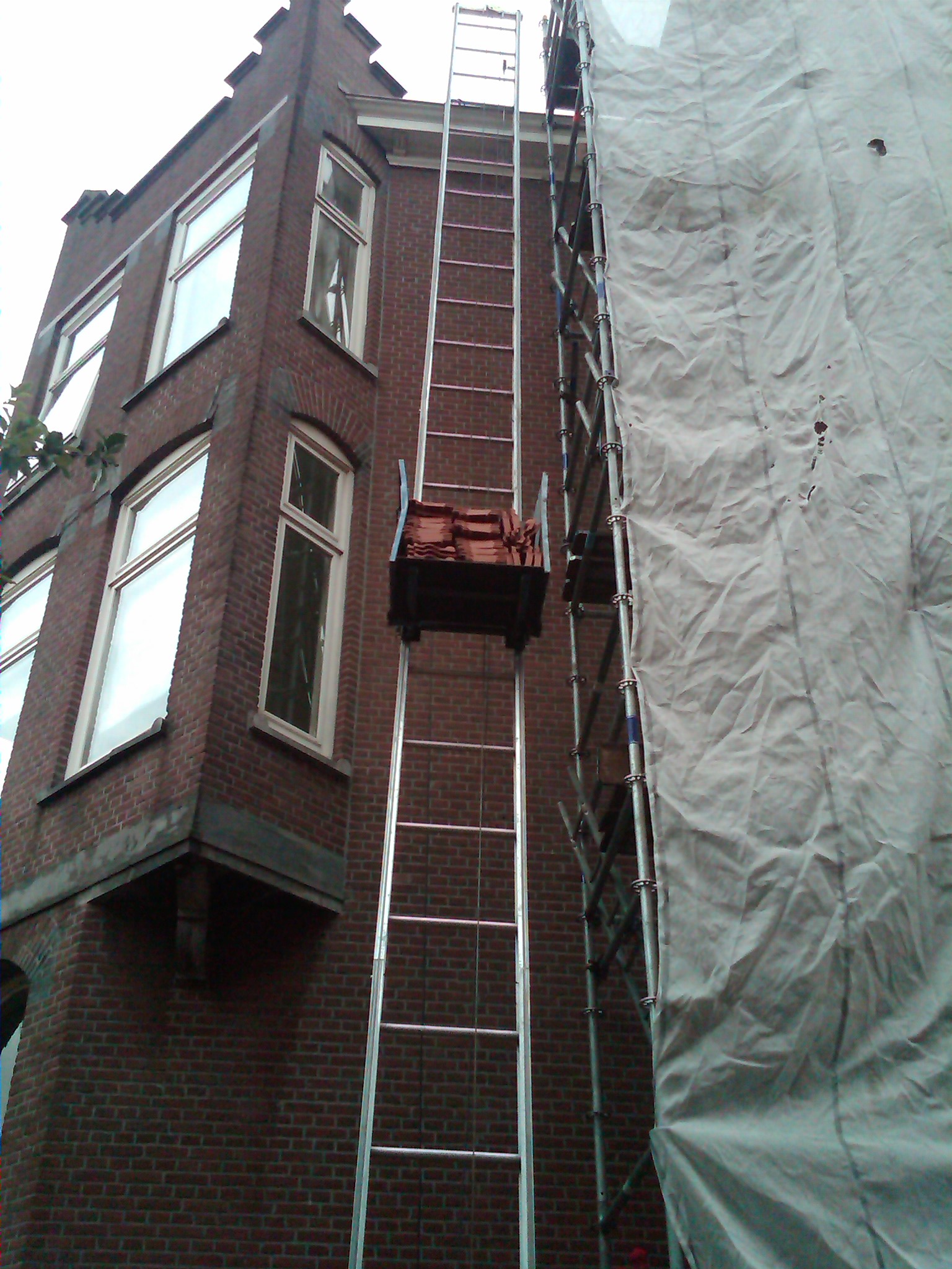 in de steigers met veiligheidsnet en met een lift, start dakrenovatie !