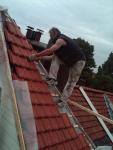 in de steigers met veiligheidsnet en met een lift, start dakrenovatie !